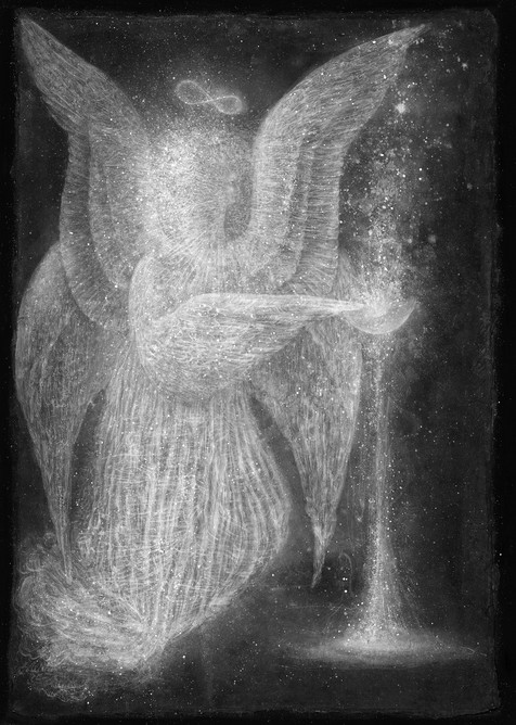 書籍表紙画やタロットカード作画などを多く手がけたイラストレーターを経て、2011年より”自動書記”とも 思われる描画が始まりました。